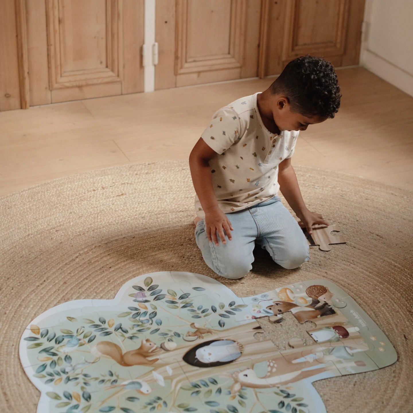 Καθώς το παιδί συναρμολογεί τα μεγάλα κομμάτια, αποκαλύπτεται μια υπέροχη σκηνή γεμάτη ζωή: σκίουροι που μαζεύουν βελανίδια, πουλάκια στις φωλιές τους, έντομα που πετούν ανάμεσα στα κλαδιά και μια φιλική αλεπού που κρύβεται στο δέντρο!