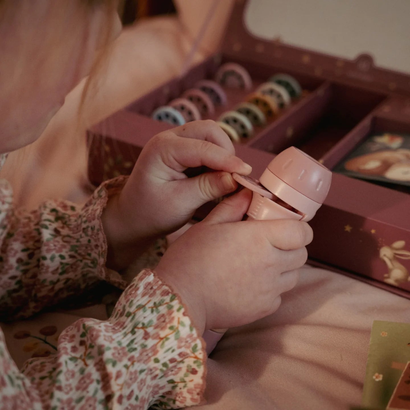 Το σετ περιλαμβάνει 12 δίσκους με διαφορετικές ιστορίες, ενώ κάθε ιστορία συνοδεύεται από το αντίστοιχο εικονογραφημένο βιβλίο, επιτρέποντας στα παιδιά να παρακολουθούν την πλοκή τόσο οπτικά όσο και μέσω ανάγνωσης. Ο φακός διαθέτει ανθεκτική ξύλινη λαβή με πιστοποίηση FSC και λειτουργεί με μπαταρίες, ώστε να μπορείτε να τον παίρνετε παντού μαζί σας.