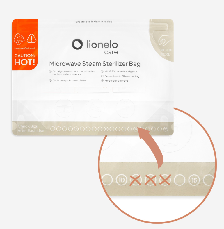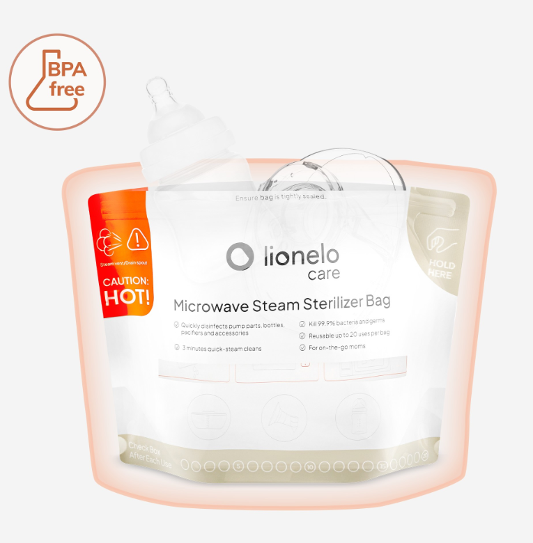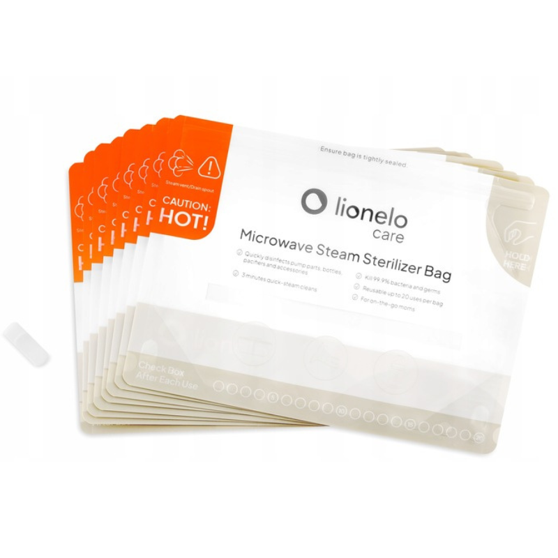 Αποστειρώστε γρήγορα, εύκολα και με απόλυτη ασφάλεια τα μπιμπερό, τις πιπίλες και τα εξαρτήματα θηλασμού με τα Lionelo Thermbag σακουλάκια αποστείρωσης για μικροκύματα.