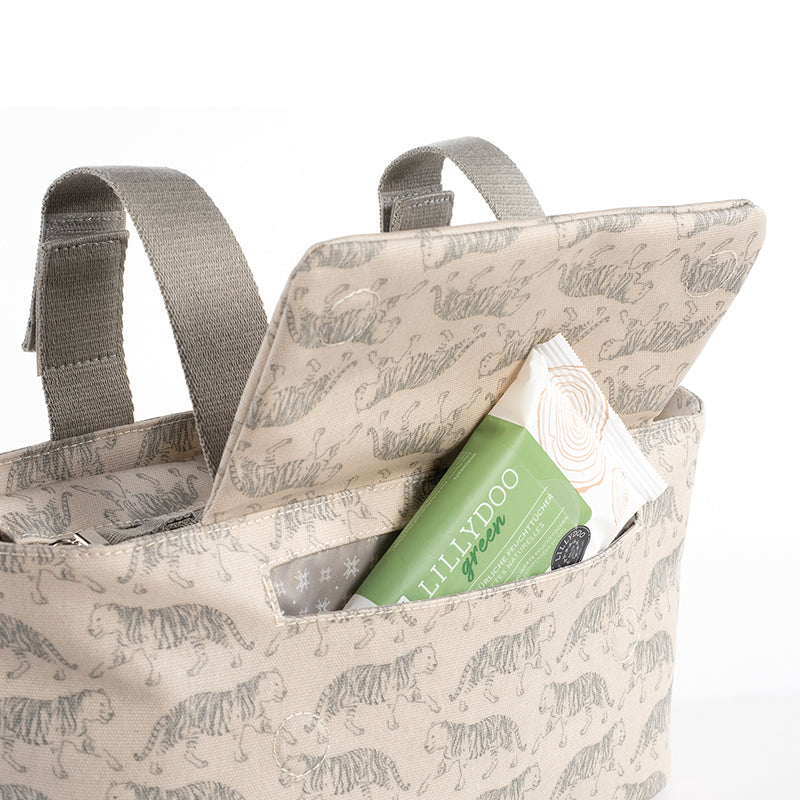 Με μεγάλη χωρητικότητα και εσωτερική επένδυση με τσέπες θα μεταφέρετε άνετα όλα όσα χρειάζεται το μωρό σας. Διαθέτει ακόμα μία εσωτερική τσέπη για βρεγμένα ρούχα που δεν επιτρέπει να περάσεις η υγρασία στα υπόλοιπα περιεχόμενα της τσάντας. Κατασκευασμένη από οικολογικό αδιάβροχο βαμβάκι.