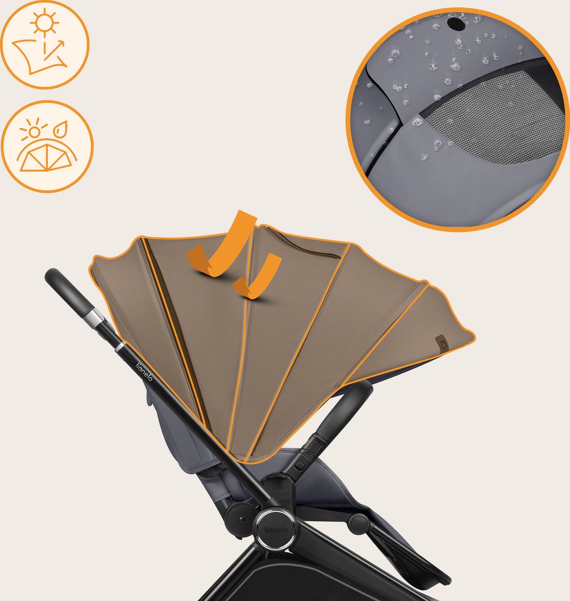 Η αδιάβροχη κουκούλα XXL με φίλτρο UPF 50+ προστατεύει το μωρό από τις μεταβαλλόμενες καιρικές συνθήκες καθώς και από την υπερβολική έκθεση σε εξωτερικά ερεθίσματα. Επιπλέον, στο πλάι του καροτσιού έχουν τοποθετηθεί ειδικοί ανεμοθώρακες.
