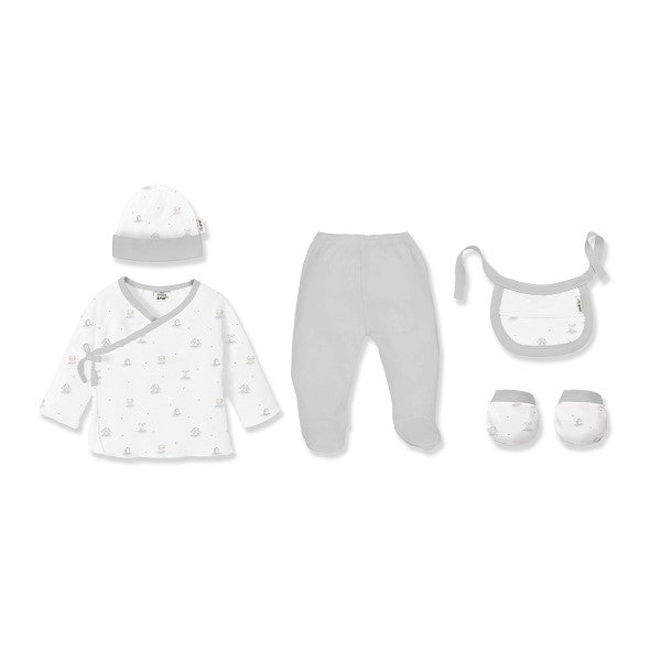 Το πρώτο σετ αποτελείται από ένα καπέλο, δύο γάντια, μια σαλιάρα, ένα μικρό μπλουζάκι και παντελονάκι με κλειστά πόδια, βασικά απαραίτητα και εύκολα στη χρήση. Το σετ ανήκει στη συλλογή παιδικής φροντίδας Interbaby και έχει μια πρωτότυπη και χαρούμενη εκτύπωση.