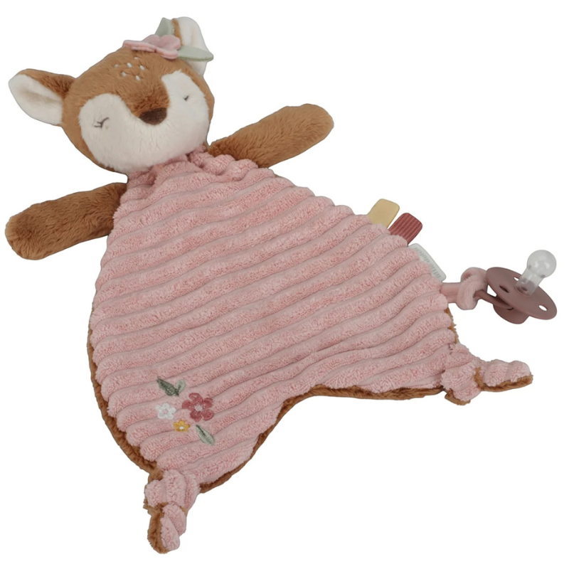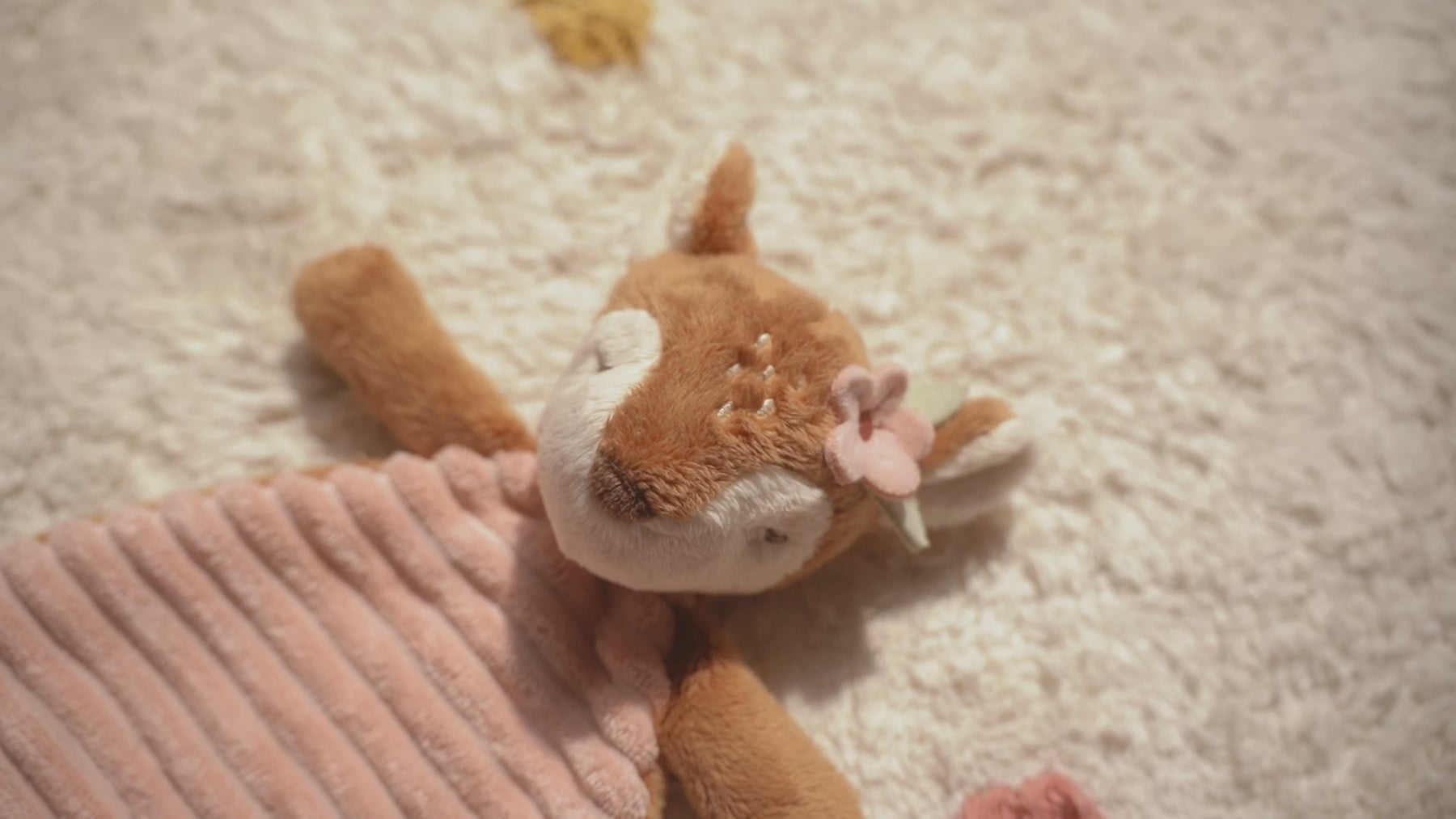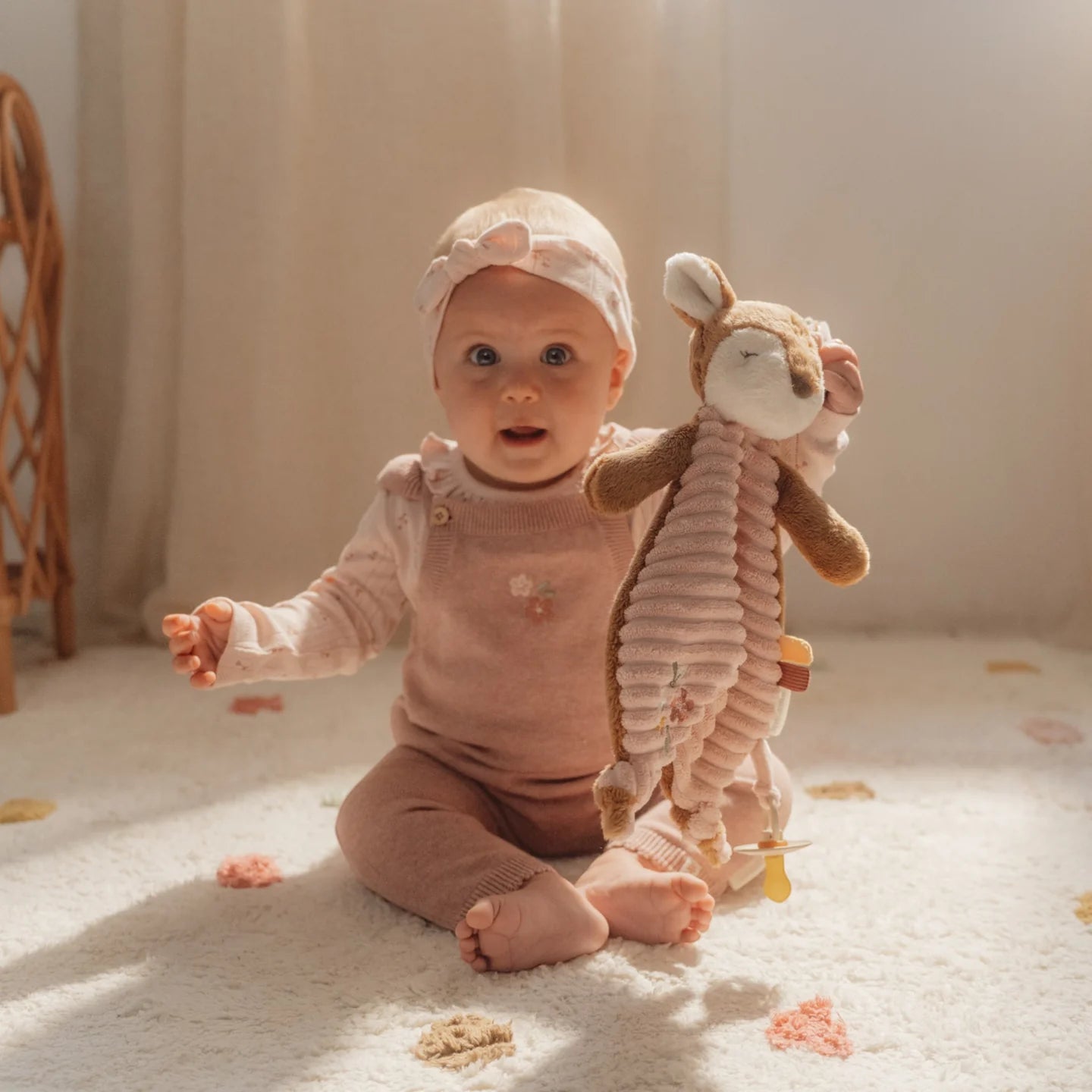 Το γλυκό ελαφάκι τυλίγει το μωρό σε μια τρυφερή, μαγική αγκαλιά, προσφέροντας συντροφιά τόσο στον ύπνο όσο και στο παιχνίδι. Το εξαιρετικά απαλό ύφασμά του διαθέτει χαριτωμένες λεπτομέρειες, όπως παιχνιδιάρικες ετικέτες και δύο κόμπους, ειδικά σχεδιασμένους για να απασχολούν και να καθησυχάζουν τα μικρά χεράκια.