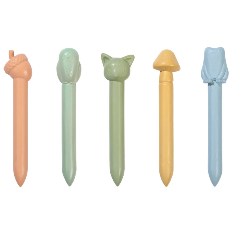 Περιεχόμενα: 5 κηρομπογιές σε ζωντανά χρώματα, η κάθε μία με ξεχωριστή γλυκιά φιγούρα στην κορυφή.