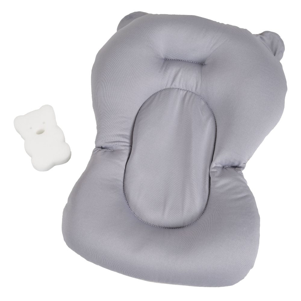 Το μαλακό μαξιλάρι μπάνιου (43 × 33 cm) στηρίζει σωστά το σώμα του νεογέννητου, κρατώντας το σε άνετη και ασφαλή θέση μέσα στη μπανιέρα, ενώ το σφουγγάρι διευκολύνει τον απαλό καθαρισμό του ευαίσθητου δέρματος.