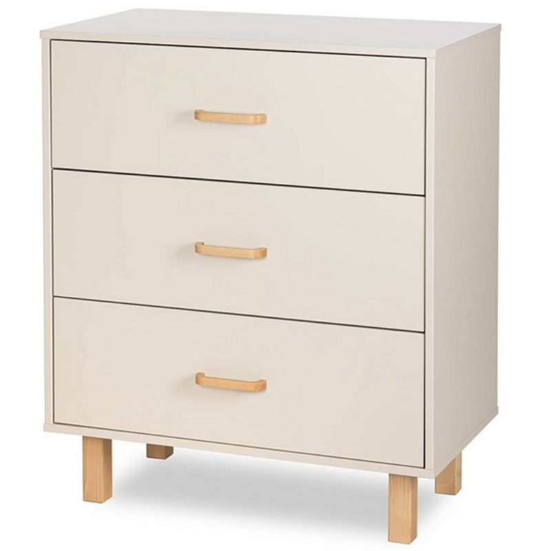 Διαθέτει τρία ευρύχωρα συρτάρια με μηχανισμό απαλού κλεισίματος, προσφέροντας άνεση και ασφάλεια στην καθημερινή χρήση. Οι ξύλινες λαβές από οξιά προσδίδουν φυσική αισθητική, ενώ τα ψηλά πόδια διευκολύνουν τον καθαρισμό κάτω από το έπιπλο, κάνοντας τη συντήρηση απλή και πρακτική.