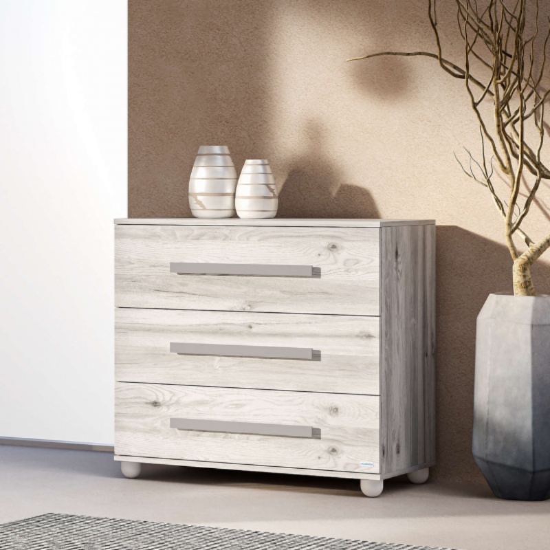 Κατασκευάζεται από μελαμίνη υψηλής ποιότητας και αντοχής, εξασφαλίζοντας στιβαρότητα, ανθεκτικότητα και μακροχρόνια χρήση. Διαθέτει 3 ευρύχωρα συρτάρια, προσφέροντας άφθονο αποθηκευτικό χώρο για ρούχα, πάνες και όλα τα απαραίτητα προϊόντα φροντίδας του μωρού.