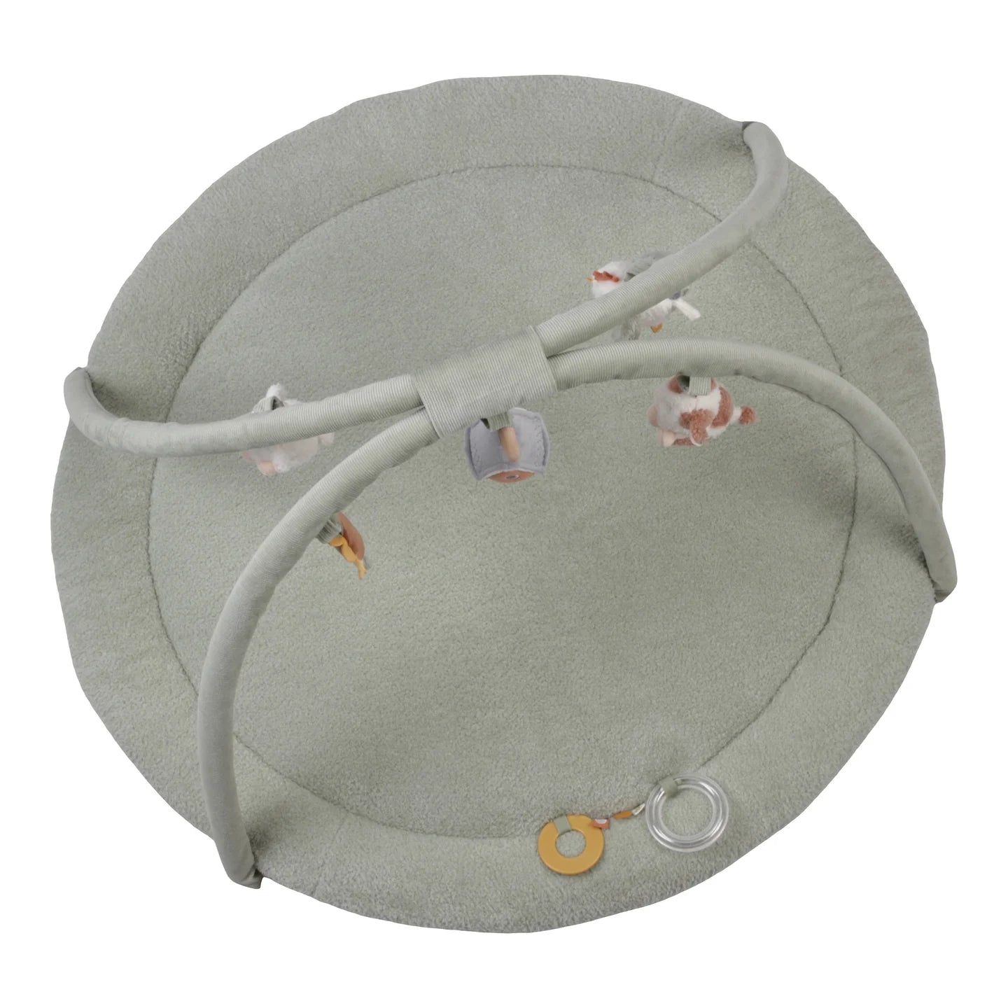 Τα χαρούμενα κρεμαστά παιχνίδια – το κοτοπουλάκι, η αγελαδίτσα, το προβατάκι, το λουλουδάκι και ο αχυρώνας – κρέμονται από τις καμάρες και προσκαλούν το μωρό να τα αγγίξει, να τα παρατηρήσει και να τα εξερευνήσει. Μέσα από το παιχνίδι, ενισχύεται ο συντονισμός χεριού-ματιού, η αισθητηριακή ανάπτυξη και η περιέργεια του μωρού.